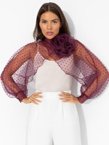 Блуза свободного кроя. Выполнена из полупрозрачного полотна рами кораллового цвета. Вырез горловины V-образный. Рукав втачной, спущенный, низ присборен на резинку. По переду выше линии груди и по спинке отрезная деталь со сборкой, по переду с завязками. Спинка с кокеткой. Длина рукава от линии втачивания 64 см. Длина спинки 70 см