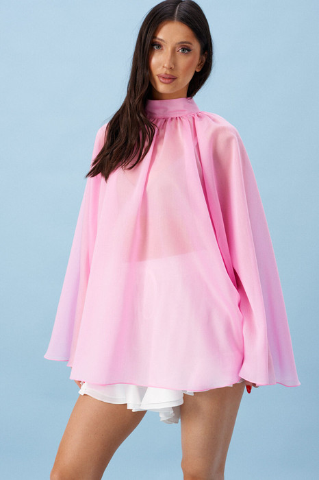 Блузка свободного кроя, выполнена из полупрозрачного полотна розового цвета. Характеристика : свободный крой, воротник стойка сзади на застежке петли пуговицы. Рукав-реглан. Длина рукава от горловины 75см, длина по спинке 74см.
