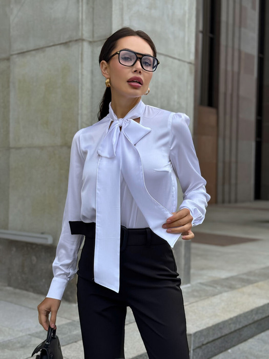 Блуза классическая, выполнена из  синтетичского шелка. Рукав втачно ношовный, обработан манжетой из основной ткани. Лиф изделия обработан притачны бантом
