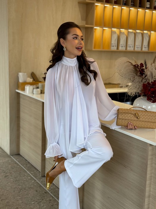 Элегантная блуза с асимметричным низом выполнена из приятного на ощупь креп-шифона. Эту модель легко вписать и в повседневный образы, дополняя брюками, джинсами, юбками или лосинами.
