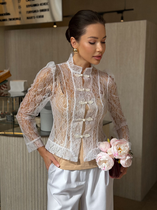 Блуза  приталенного силуэта выполнена из ажурного эластичного гипюра, рукав втачной, приспоборенный по плечевому шву.Застежка - текстильные клеванты в тон блузы.  Элементы барокко создадут неповторимый аристократичный  образ. Для практичности блуза дополнена отдельнымтопом нюдового отттенка. Топ трикотажный, обработаны тонкие бретели из основно ткани.
