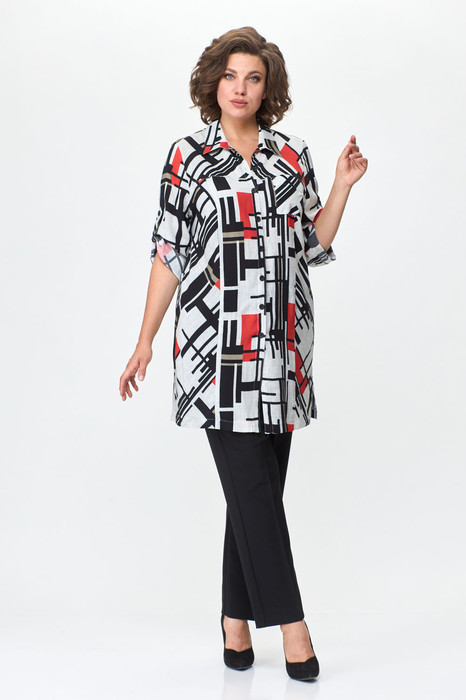 Блуза удлиненная из текстильной ткани, свободного силуэта. Застежка центральная на петли-пуговицы. Воротник отложной на стойке. По переду обработаны кокетки и вертикальные рельефы от нее. По левой полочке в области груди небольшой настрочной карман. Спинка с кокеткой. Рукава укороченные, втачные, с патой. Длина рукава 46 см, длина по спинке 86 см.