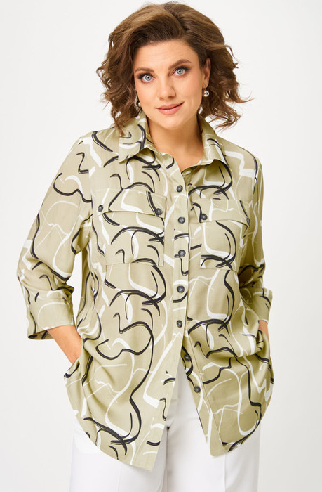 Блуза женская, прямого силуэта из текстильной ткани. Воротник отложной, застежка центральная на петли-пуговицы. По переду нагрудные вытачки и настрочены накладные карманы. Спинка цельная. Рукав втачной, одношовный, 3/4, с притачной манжетой. В боковых швах по низу небольшие разрезы. Длина по спинке 74 см, длина рукава 45.