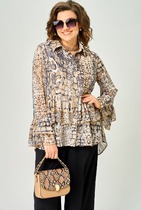 Блузка женская свободного силуэта выполнена из блузочной ткани с добавлением эластана, горловина круглая на обтачке, перед короче спинки, по спинке застегивается на петли и пуговицы. Рукав втачной 3/4 фигурный на манженте с пуговицей. Длина блузки по переду 58 см, по спинке 89 см (украшение в комплект не входит)