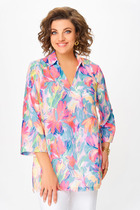 Блузка прямого силуэта, с круглым вырезом горловины и широкой планкой, от которой расположена сборка. В блузке боковые швы переходят на деталь переда и заканчиваются разрезами. Блузка с небольшим перепадом длины. Спинка на широкой обтачке. Рукава на резинке, длиной 3/4. Длина блузки - 70 см.