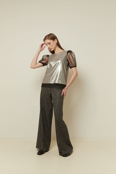 Блузка женская на подкладке, прямого силуэта. Спинка и перед из полотна с пайетками. По горловине спинки и переда кант из сетки. Рукава из сетки, втачные, форма «фонарик», по окату и низу рукава сборка. Низ рукавов обработан резинкой. Нижняя часть спинки и переда из сетки, по бокам разрезы.