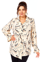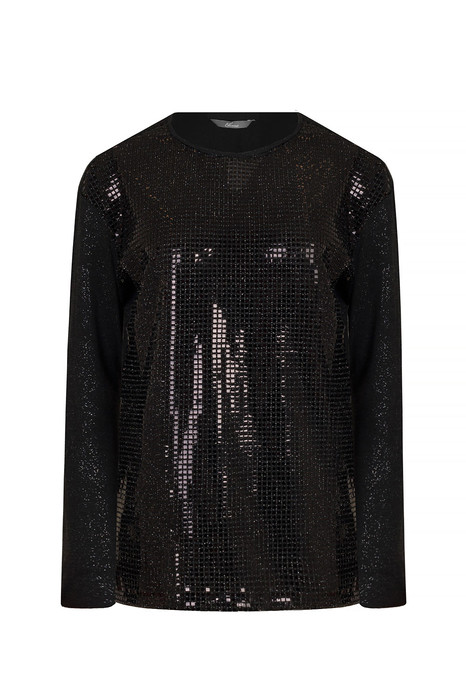Блузка женская, прямого силуэта длиной до середины бедра. Рукава втачные одношовные, длинные, плечо спущено. На спинке средний шов, в верхней части разрез застегивается на петлю и пуговицу. Перед из ткани с паетками. Горловина обработана кантом.