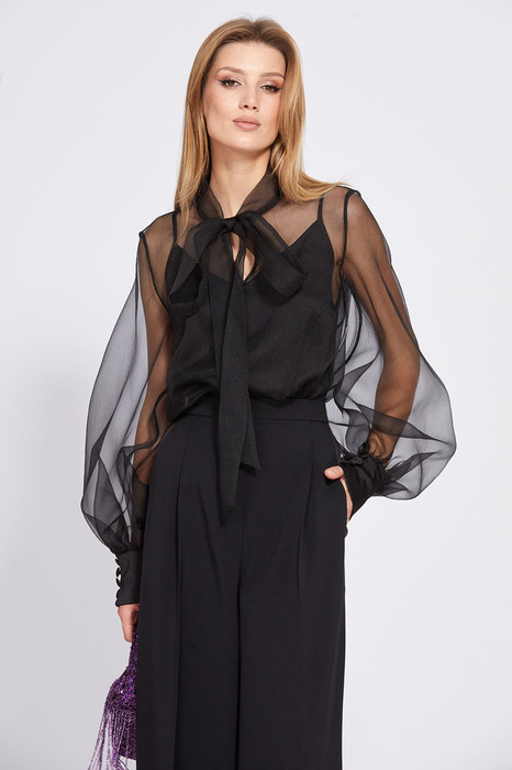 Блузка + топ. Блузка выполнена из органзы. Блузка прямого силуэта, длиной выше линии бедер. Перед и спинка цельные. Спереди прорезь. Воротник-стойка, переходящий в бант. Рукав втачной, одношовный, расширенный к низу и присборенный. Низ рукава на притачной манжете из отделочной ткани, застегивающейся на четыре пуговицы. В комплект входит топ из атласа. Топ на регулируемых бретелях. Перед и спинка топа цельные.