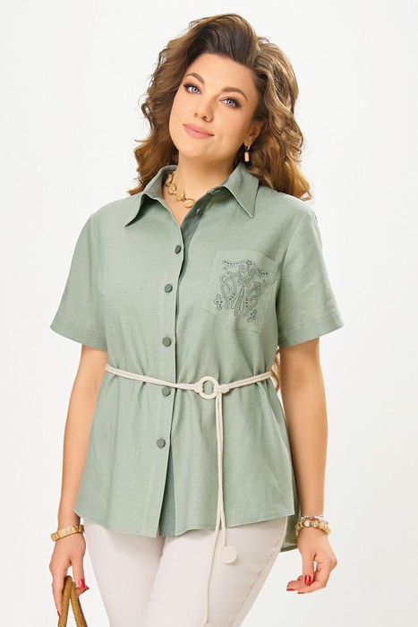 Воротник-стойка рубашечного типа добавляет структуру и выразительность, а нагрудная выточка обеспечивает идеальную посадку. Левую полочку украшает накладной карман с декоративной печатью, подчеркивая стильный акцент. По спинке блузки расположена изящная декоративная печать, придающая изделию оригинальности и индивидуальности.