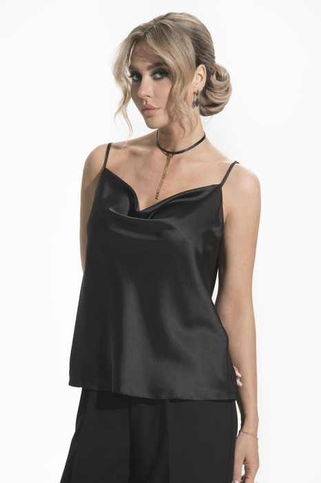 Топ на бретелях. Перед двойной, со сгибом по верху. Сгиб формируется в мягкие драпировки. Спинка с V-образным вырезом.