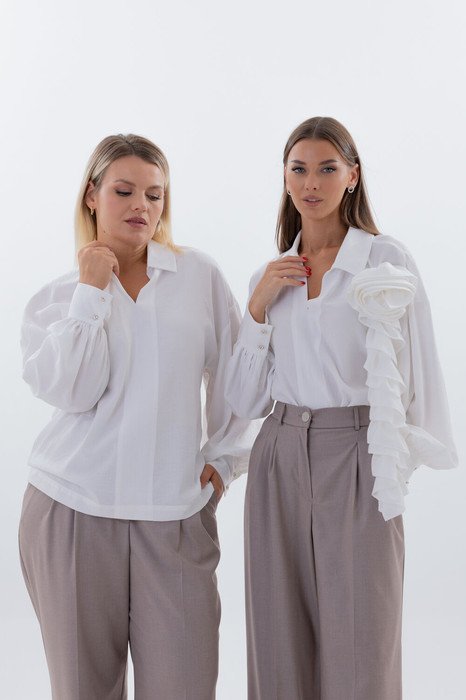 Главная особенность этой блузы — съемный декоративный элемент: ниспадающий цветок, который становится живым акцентом всего образа. Его можно носить, позволяя ему струиться ниже линии пояса, создавая романтичный силуэт, или снять для более лаконичного и строгого стиля.