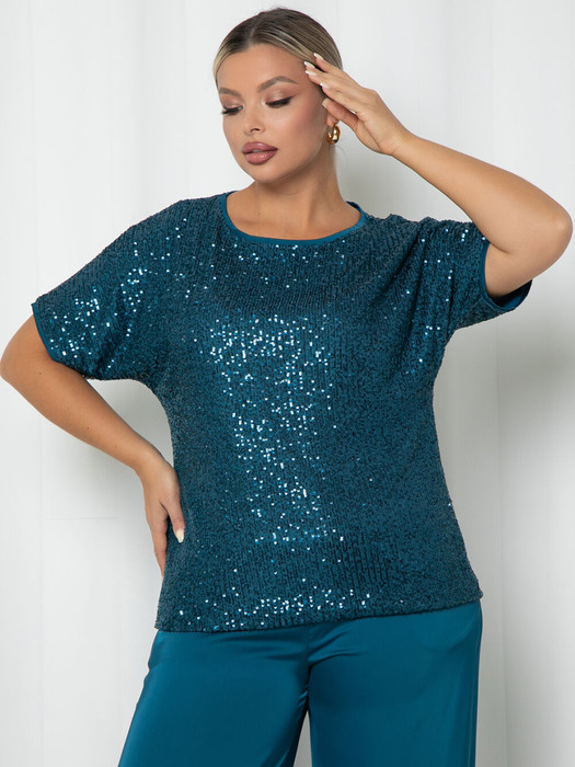 Блузка прямого силуэта из пайеток на трикотажном подкладе с цельнокроеным рукавом.