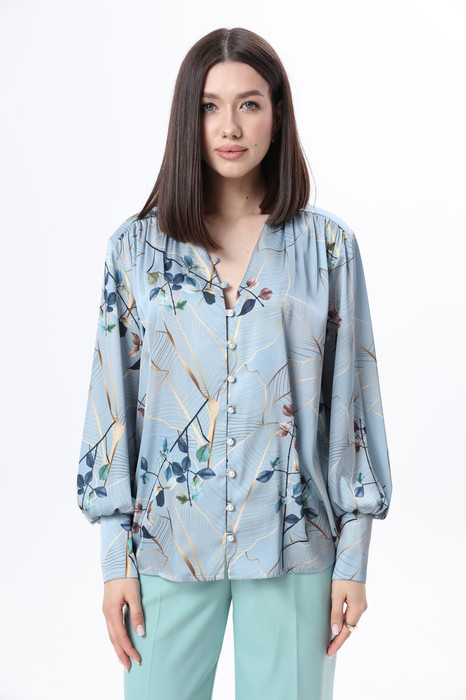Изящная блуза из тонкой и нежной ткани с атласным эффектом - отличный выбор для вечера! Блуза свободного силуэта с V-образным вырезом. Это довольно глубокий вырез, который прекрасно подчёркивает женскую грудь и линию шеи. Застежка на навесные петли и пуговицы. Рукава длинные объёмные втачные заканчиваются широкой манжетой с застёжкой на навесные петли с пуговицами.