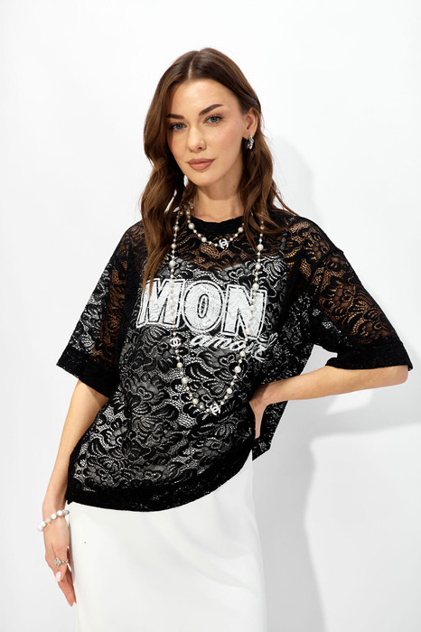 Оригинальный джемпер из эластичного кружева прямого силуэта, вырез горловины округлый, обработан притачной планкой.  По переду выполнена дизайнерская печать контрастного цвета.