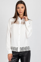 Блузка женская прямого силуэта на центральной застежке на петли и пуговицы. Перед с нагрудными вытачками от боковых швов. Спинка цельнокроеная. Рукав втачной одношовный длинный по низу со сборкой и на манжете, застегивающемся на петлю и пуговицу. Горловина на стойке с воротником.