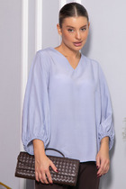 Блуза прямого силуэта. В боковых швах разрезы . Низ разноуровневый. По переду нагрудные вытачки и декоративная вышивка. Спинка со средним швом.Плечо немного спущено. Рукав рубашечного покроя , 3/4, слегка расширен к низу. Горловина "лодочка".