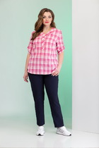 Блузка женская c рубашечным воротником, свободного силуэта с кокетками спинки и полочек. По спинке заложена встречная складка, плечо спущенное. Рукав прямой, втачной с манжетой на застёжку петля-пуговица. По низу изделия пояс-кулиска со шнурком, завязывающимся в бант. По воротнику, по кокеткам и по плечевым швам отделочная строчка.