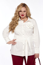 Женская нарядная рубашка свободного кроя со спущенной линией плеча. По переду планка на застежку петли пуговицы и V-образным вырезом. Спинка блузки со сборкой и кокеткой. Рукав длинный с манжетой на застежку петля-пуговица и сборкой по окату. Низ изделия фигурный.