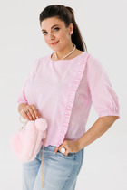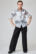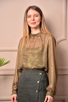 Блузка свободного кроя с цельнокроеным рукавом, воротник со стойкой. Рукав длинной ниже локтя с  широкой манжетой  на застежку  петли - пуговицы. Спинка блузки  стачная по среднему шву с обработанным разрезом на застежку пуговицу.  Низ  собран  на эластичную ленту.