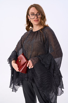 Блуза свободного силуэта с присборенной горловиной, обработанной бейкой. Спинка со средним швом, переходящим в разрез. Рукава реглан с асимметричными воланами. Нижний край блузы с двойным воланом.