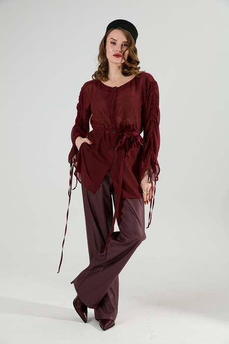 Блуза прямого кроя с центральной застёжкой на петли и пуговицы. Вырез горловины глубокий округлый. Линия плеча приспущена. На рукавах изделия заложена декоративная сборка с регулируемыми завязками (кулиса). В комплект к изделию идёт узкий пояс из основной ткани с авторским украшением ручной работы.