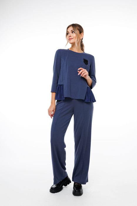 Блуза прямого свободного кроя с округлым вырезом горловины с декоративной нашивкой. По переду две отлетные складки в рельефе. Рукава втачные длиной три четверти. По низу изделия притачной волан из трикотажного гофре.