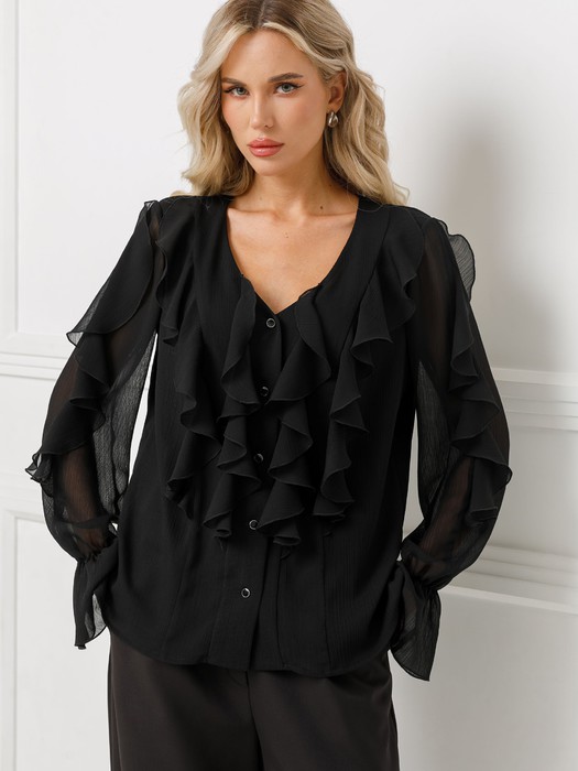 Модель прямого силуэта, на подкладе. Перед с рельефами. Застёжка центральная на петли и пуговицы. В боковых швах разрезы. Рукав со сборкой на резину на уровне запястья. Блузка декорирована воланами.
