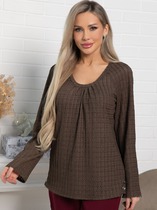 Блузка прямого силуэта с втачным рукавом. Горловина округлая с планкой по переду.  Рукав длинный,  по низу со сборкой и притачной манжетой с застежкой на петлю и пуговицу. Рукав и нижняя деталь спинки из сетки. Низ блузки асимметричный, спинка длиннее переда.   Планка по горловине, низу переда и манжеты выполнены из отделочного материала.
