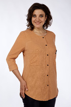 Блузка женская из поливискозной эластичной ткани. Перед цельнокроеный с нагрудными выточками и продольной бантовой складкой по центру. Ширина складки 5 см. Спинка разрезная из двух частей. В среднем шве спинки по горловине обработан разрез с застёжкой на навесную петлю и потайную пуговицу. Рукав втачной одношовный. Низ рукава обработан манжетой с застёжкой на пробивную петлю и декоративную пуговицу. Ширина манжеты 2,5 см.