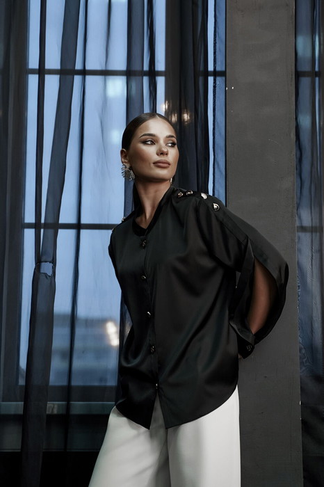 Блузка женская из блузочной ткани с деликатным блеском, свободного силуэта, с застежкой по переду сверху до низа блузки на пять петель и пуговиц. Рукава длинные со складкой внизу, низ рукава на манжете, манжет застегивается на петлю и пуговицу. По плечевым швам и рукаву имитация застежки на планку по всей длине. По планке в верхней части четыре петли и декоративные пуговицы, снизу рукав с «распахивающимися» планками. Воротник - невысокая стойка, прилегающий к шее. Блузка декорирована эффектными пуговицами в стиле «скиапарелли».