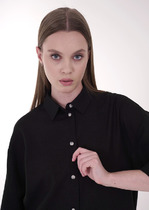 Блузка из плательно - блузочной ткани свободного силуэта. Спинка с кокеткой и встречной складкой. По переду центральная застежка на кнопки, сверху накладные карманы с клапанами. Втачной рукав с отстегивающейся нижней частью. По низу рукава манжет с кнопкой. Воротник рубашечный со стойкой.