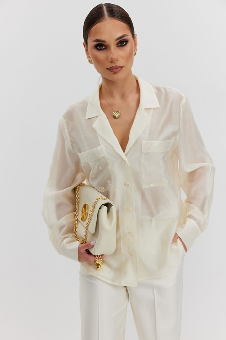 Блузка женская свободного силуэта, из полупрозрачной ткани вуаль. Воротник отложной с лацканами, застежка центральная на 5 петель и пуговиц, по переду накладные карманы из отделочной ткани с вышивкой, рукав свободный, по низу манжета с пуговицами. Длина 66 см, длина рукава 61 см.
