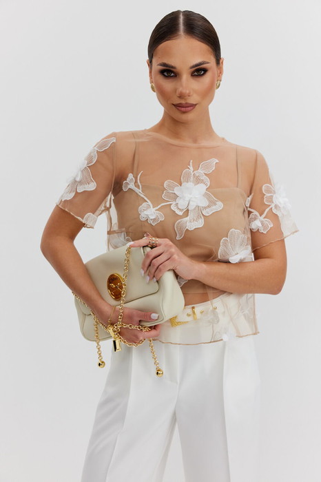 Блузка  женская прямого силуэта из фактурной ткани «цветы на сетке», по горловине спинки застежка на декоративный крючок, рукав короткий, горловина круглой формы. В комплекте нижний топ-бандо на бретелях из эластичного трикотажного полотна.