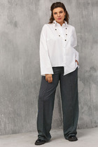 Стильная укороченная блузка белого цвета создана для комфорта в любой ситуации. Эластичный хлопок делает модель приятной для тела и хорошо дышащей, что особенно важно в течение долгого дня. Свободный крой не ограничивает движения, подходит на любую фигуру и гармонично смотрится в разных образах. Повседневная блузка держит форму даже после продолжительной носки, что помогает всегда выглядеть аккуратно. На чуть удлиненной спинке выполнена декоративная складка, придающая дополнительный объем и интересный силуэт. Отложной воротник придает классический вид,, подходящий для офисных будней. Особенно стильно рубашка смотрится в непринужденных, городских или повседневных комплектах.