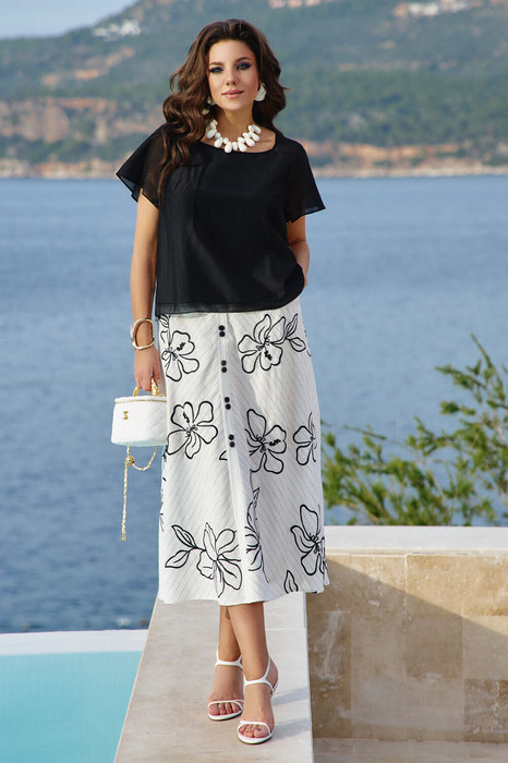 Блуза женская из полупрозрачной чёрной ткани, которая струится по телу, сквозь которую мерцают контуры силуэта. Ткань мягкая, воздушная, почти невесомая, но при этом обладает благородной структурой, которая держит форму. Блуза свободного силуэта, с фигурной формой горловины. Рукава в блузе короткий, на основе реглана. Деталь переда двойная, с нагрудными вытачками. Спинка в блузе с отрезной кокеткой. От подреза деталь спинки выполнена из отделочной ткани в принт-полоску. Отделочная ткань более плотная, с выраженной текстурой. Полоски не просто нарисованы — они тканые, что чувствуется пальцами: можно провести по ним и ощутить рельеф. Низ в блузе фигурный. Длина блузы 56 см (р 52-56), 57 см (р 56-60)