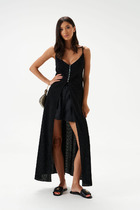 Блузка с короткими рукавами. Сзади - застежка в виде змейки. Спереди посередине модель украшена вертикальной планкой с интересным рисунком. Длина изделия - 61 см.