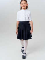 Блузка для школы выполнена из трикотажных полотен : интерлока и ажура.Привлекают внимание кокетка ,окаймленная рюшкой, и верх рукава " фонарик ".
