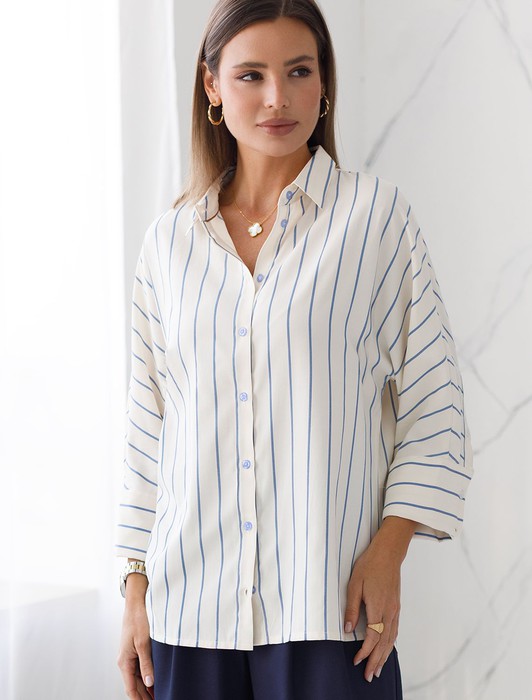 Состав: 75%Хлопок 25%ПЭ Плотность: 108 Г/м2Стильная блузка молочного цвета в голубую полоску идеально держит форму и подчеркивает любую фигуру. Свободный крой с цельнокроеным рукавом 3/4 создает эффект легкой непринужденности и комфорта, а манжеты на рукавах добавляют аккуратности и завершенности образу. Отложной воротник придает блузке классическую нотку, которая гармонично сочетается в деловом образе. Хлопок с добавлением эластана гарантирует отличную посадку, подчеркивая достоинства и скрывая недостатки, при этом сохраняет свежесть на протяжении всего дня. Такая рубашка станет великолепным выбором для тех, кто ценит удобство и стиль одновременно. Модель удачно сочетается с различными предметами гардероба, позволяя создавать стильные и практичные образы в любую погоду.