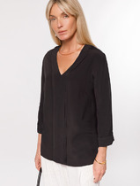 Блуза женская из фактурного полотна, с короткими втачными рукавами и стояче-отложным воротником. V-образный вырез горловины обработан втачными планками. Нижние срезы рукавов и изделия обработаны подгибкой. По воротнику настрочена отделочная строчка.