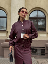 Бомбер выполнен из эко-кожи. Низ изделия и низ рукавов обрабтан широкой резинкой. Застежка - на пуговицы по центрру переда.
