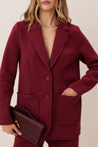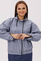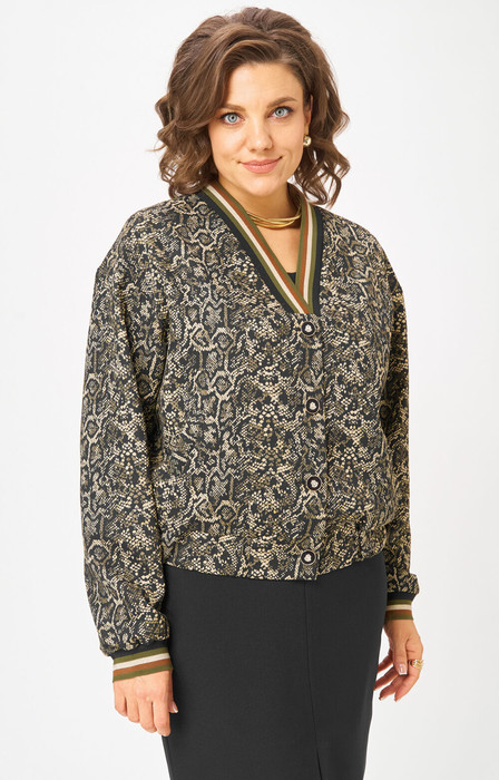 Жакет-бомбер из текстильной ткани, свободный, со спущенной линией плеча, с центральной застежкой на петли-пуговиы, на подкладке. Горловина V-образная, переходящая в стойку. Детали переда с прорезными карманами с листочкой. Спинкацельная. Рукав втачной, одношовный. По низу жакета планка с резинкой. Длина по спинке 55 см. Длина рукава 64 см.