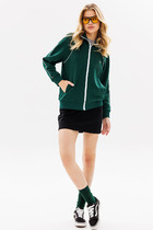 Куртка-бомбер – молодежная из гладкокрашенного трикотажного полотна «дабл-флис» (двухсторонний флис) прямого силуэта, свободная, с длинными втачными рукавами, горловиной овальной формы, обработанной втачной планкой, центральной бортовой застежкой на тесьму «молния». Полочка и спинка состоят из двух деталей, низ изделия с притачным поясом, рукава с притачными манжетами. Пояс, планка горловины, манжеты рукавов выполнены из основного материала.