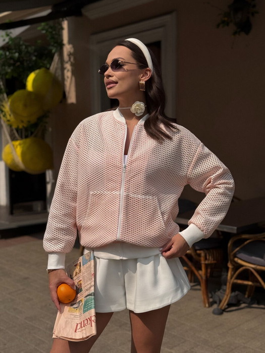 Жакет - бомбер женский, прямого силуэта, со спущенной линией плечевого шва, выполнен из трикотажногосетчатого полотна.