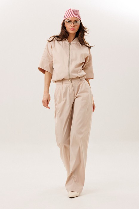 Бомбер прямого силуэта до бедер. Рукав цельнокройный с манжетой. Воротник стойка. Пояс собран на эластичную резинку. По переду застежка на молнию.