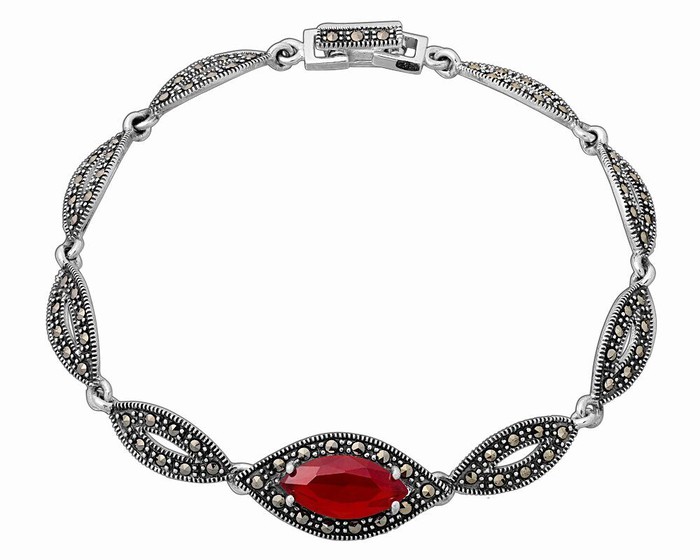 Вес: 10.43 г Вставка: Марказит Цвет камня: Красный Производство: Таиланд Покрытие: Оксидирование Количество: 6Браслет, арт.656340 Серебро Серебро 925, р. 20, 10,43 гр., марказит , синт.рубин