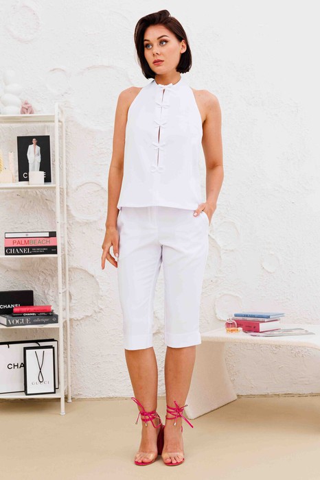Бриджи прямого силуэта, застежка-гульфик, в боковых швах  и по задним половинкамобработаны карманы. обработан невысокий разрез по низу в боковых швах