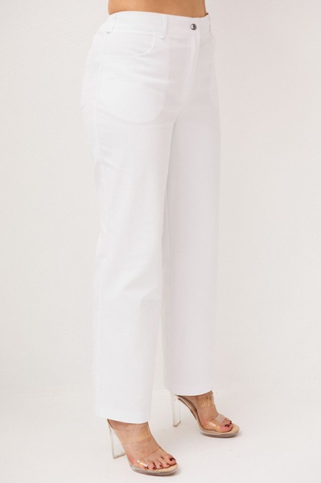 Прямой крой и высокая посадка красиво подчеркивают силуэт и обеспечивают безупречную посадку по фигуре. Застёжка на молнию, петлю и пуговицу аккуратно фиксирует изделие по линии талии, а пояс по спинке добавляет удобства и мягко адаптируется к фигуре.