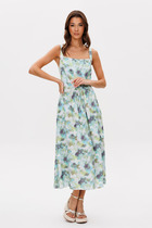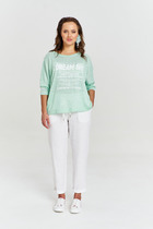 Брюки свободного кроя. Выполнены из хлопкового полотна серо-голубого цвета. Пояс по переду стабильный, пояс по спинке на резинке. По переду от пояса складки. В боковых швах карманы с отрезным бочком. По заднему полотну накладные клапаны (имитация карманов). Застёжка центральная; молния, пуговица. Длина по боковому шву 102 см. Брюки дополнит жилет А5483