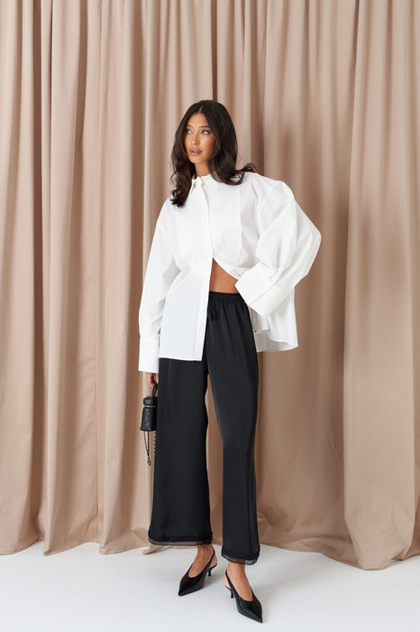 Брюки выполнены из атласной струящейся ткани черного цвета. Характеристики: прямой свободный крой, пояс на кулиске , в боковых швах карманы, декоративное кружево по низу изделия. Длина брюк 195 см.