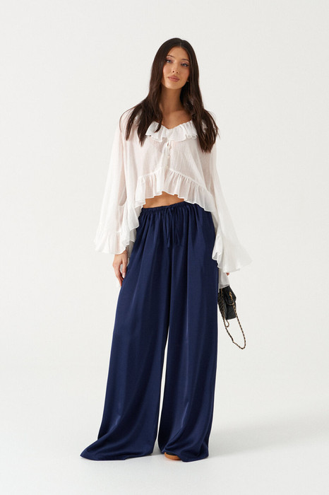 Брюки свободного кроя. Выполнены из мягкой струящейся ткани синего цвета. Пояс на резинке, со шнурочком. В боковых швах карманы. Длина бокового шва (с учётом пояса) 107 см